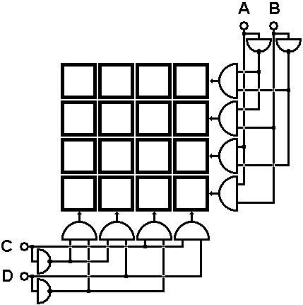 In diesem Schema sind die Speicherzellen in einer "4 x 4 -Matrix" mit 4 Zeilen und 4 Spalten angeordnet in dem die Eingänge A und B die Reihe, die Adresseingänge C und D die Spalte angeben.