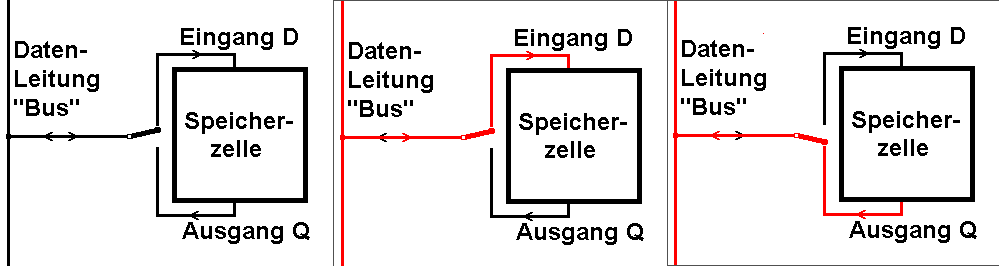 Die Datenleitung soll zum Schreiben in den Dateneingang mit D und zum Lesen aus dem Datenausgang der adressierten Speicherzelle mit Q verbunden werden.