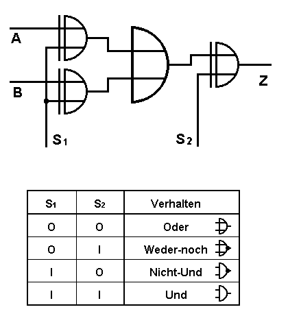 diese Baugruppe verliert ihre konstruktionsbedingte Starrheit - wir bekommen ein "Universalgatter", dem wir durch zwei elektrische Steuerbefehle mitteilen, wie es die Datensignale zu verarbeiten hat:
