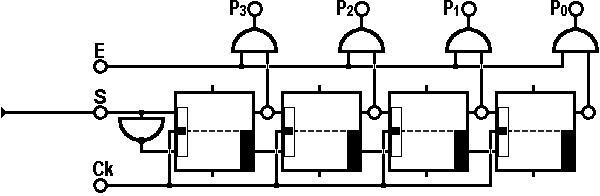 Der "fertige" Inhalt des Schieberegisters wird mit E="1" auf den parallelen Datenbus (der hier nur 4 Bit breit iet) übertragen.