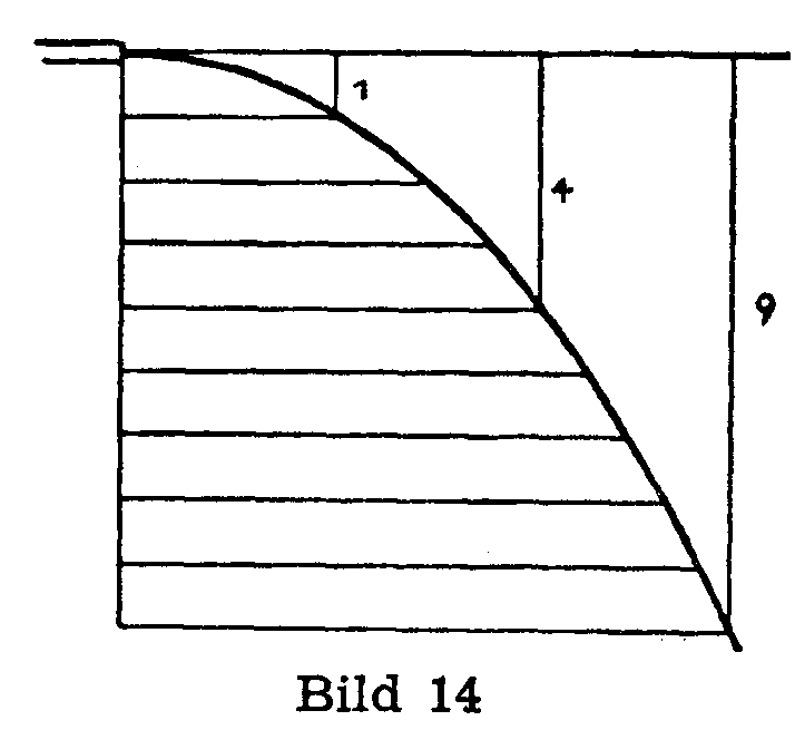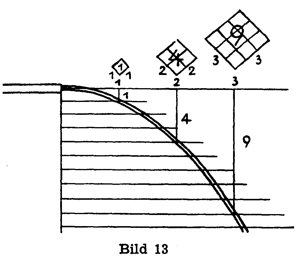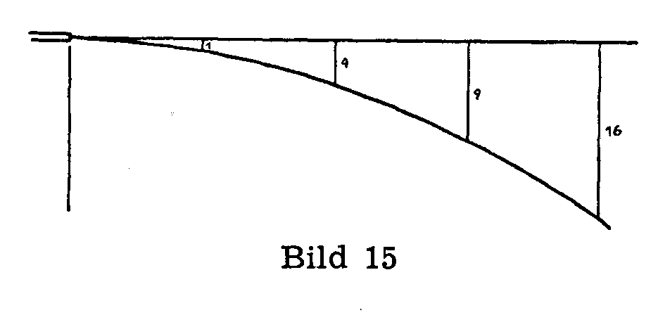 Nun dürfen wir nach allem, was wir wissen, sagen: Nach 2, 3, 4,... Zeitspannen ist der im Strahle fallende - von uns in Gedanken herausgegriffene - Tropfen 4-mal, 9-mal, 16-mal usw. tiefer gefallen als in der ersten Zeitspanne! (Bild 21).