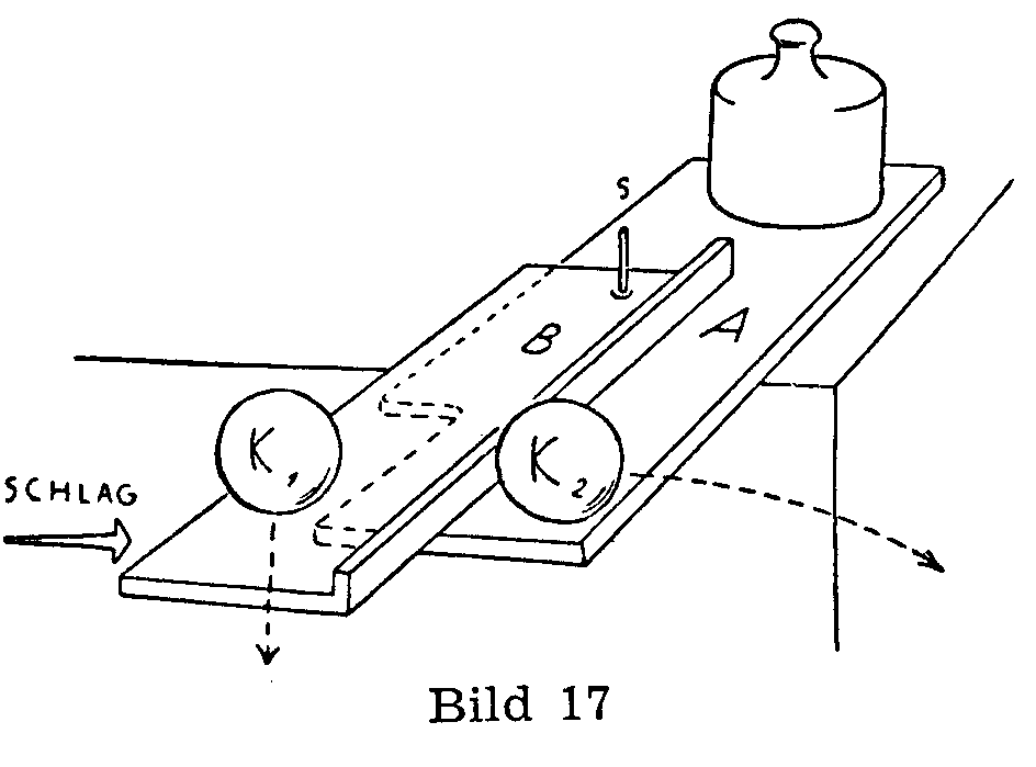 Einige Meter über dem Boden wird A befestigt, so dass seine Ebene, und damit auch die von B,' waagerecht liegt. Ein heftiger schneller Schlag, an der bezeichneten Stelle mit der Hand oder einer Latte gegen B geführt, nimmt die locker auf B liegende Kugel K1 wegen ihrer Trägheit und wegen der geringen Reibung nicht merklich mit, sondern entzieht ihr nur den Boden, so dass sie (A ist unter ihr ausgespart) senkrecht frei abwärts fällt, während gleichzeitig die am Rand von A liegende zweite Kugel K2 durch die (wenn nötig, erhöhte) Kante von B waagerecht fortgeschleudert wird. (K1 liegt etwas höher als K2, man kann das durch eine leichte Unterlage ausgleichen, die man K2 unterschiebt, etwa eine Streichholzschachtel).