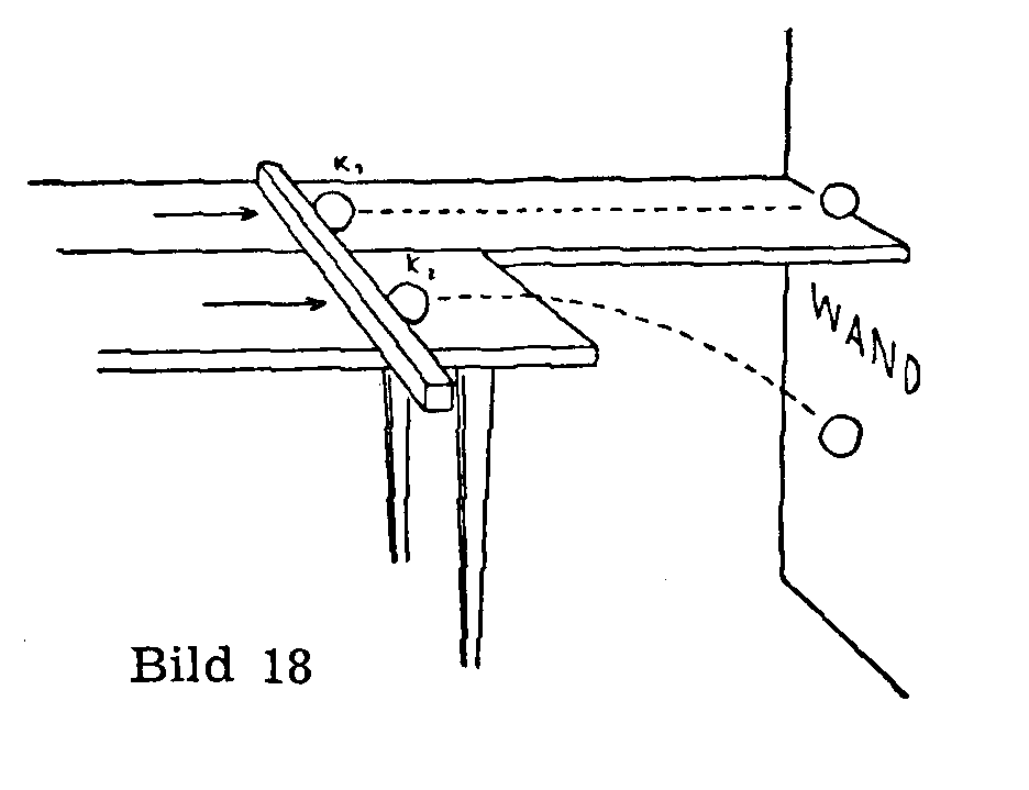 So entsteht, in voller Entsprechung zur vorigen, die folgende, ebenfalls sehr einfache Versuchs-Anordnung: an eine waagerechte Tischplatte baut man seitlich in gleicher Höhe und Ebene ein glattes, möglichst poliertes Brett so an, wie das Bild zeigt. Auf dieser Bahn soll die eine Kugel, K1 der Schwere enthoben und möglichst reibungslos bis zur Wand rollen, während die zweite, K2 durch die Latte zusammen mit K1 und mit derselben Geschwindigkeit in Fahrt gebracht, unterwegs abstürzt und also geworfen wird.