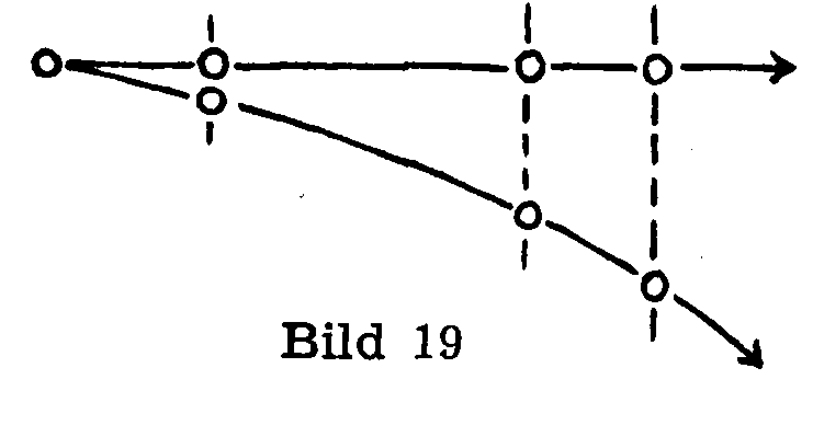 2. Das Trägheitsgesetz in seiner strengen Form, in der es sagt, ein kräftefreier Körper bewege sich unaufhörlich auf gerader Bahn gleichförmig weiter, wurde im Vorigen nicht ausdrücklich gebraucht. Wir konnten uns begnügen mit der Beobachtung, dass im Bild 18 die rollende Kugel K1 nachdem sie von der schiebenden Latte losgelassen ist, ihre Bewegung ohne merkliches Zögern fortsetzt, so dass sie - (in dem später ausgesprochenen Sinn) eine Uhr ersetzen darf, die für unsere nicht übertriebenen anfänglichen Ansprüche genau genug geht. Selbstverständlich wird man zu einer letzten Klärung des Fallgesetzes und auch der Wurflinie das Trägheits-Gesetz brauchen.