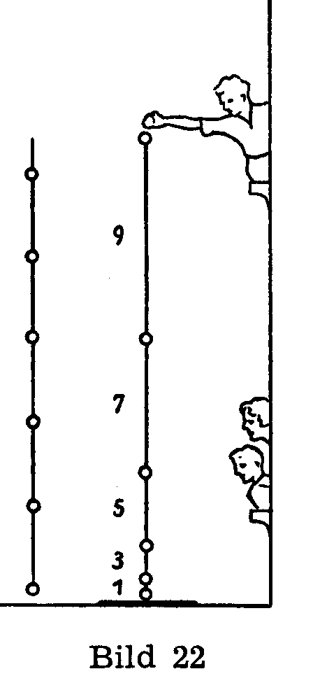 Da gibt es nun, hat man erst einmal das quadratische Gesetz, den einfachen Versuch mit den sogenannten "Fallschnüren". Jede Arbeitsgruppe oder Klasse, jeder einzelne, kann sie sich selbst machen. Die ganze Schnur wird so lang gewählt, dass sie, aus dem höchsten erreichbaren Fenster gehalten, gerade bis kurz vor den Boden reicht. Dann werden Steine (oder Bleistücke oder Schraubenmuttern), von unten an gerechnet, in quadratischen Abständen eingeknotet, wie das Bild 22 zeigt. Losgelassen, stürzt die ganze Schnur, und die Steine knallen unten auf ein untergelegtes Blech: sie zählen uns dann gleiche Zeiten vor!