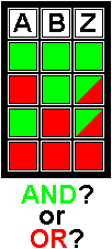 By the table on the left side - to "green" it is AND, but to "red" it is OR...
