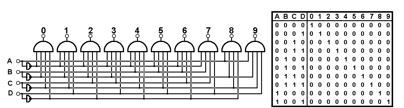 The Input signals A, B, C, D are unaltered, or inverted respectively given to ten AND-Gates, each with four inputs. Each gate is wired to its special selection. If all inputs of this gate are "1" the appropriate number will be shown.