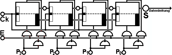 Anschließend werden sie mit E=1 in das Schieberegister geladen und mit (in diesem Fall) 4 Taktpulsen in die serielle Datenleitung geschoben.