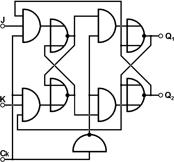 Das ist nun eine wirklich geniale Idee: Die Ausgänge des Master-Slave-Flipflops werden (über Kreuz) auf die Eingänge rückgekoppelt.