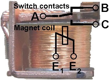 Its principle is rather simple: An electro-magnet (that is a spool of insulated copper wire around a iron core) becomes magnetic, when a current is flowing between the points E1 and E2. Now the "contact tongue" is pulled down and the current - formerly passing between A and B will now be led between A and C. When the current is off, the core will immediately loose its magnetism, and the contact tongue will switch to its former position AB.