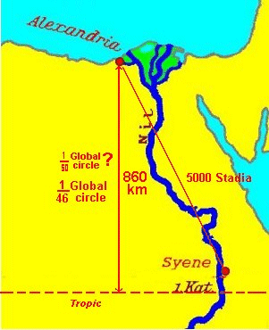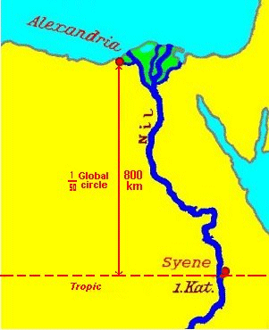 "Eratosthenes by noon of June 21, measured the shadows of the obeliscs in Syene (Assuan nowadays) and Alexandria. In Syene the obelisc had no shadow, in Alexandria the angle of the shadow was 7° 12'. As Eratosthenes assumed the earth as a sphere and (by mistake) Syene being 5000 stadia south of Alexandria he calculated from that a circumference of the earth of 250000 stadia..."