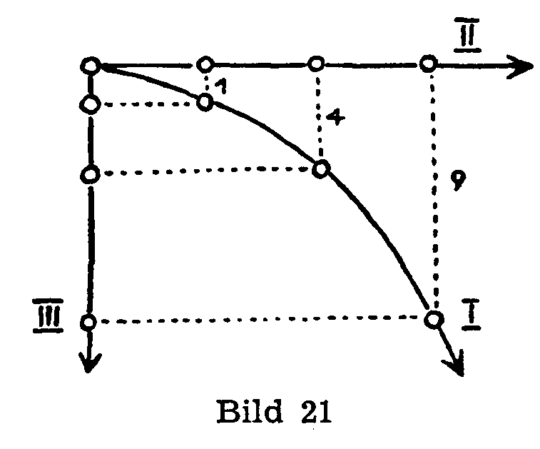 Nun dürfen wir nach allem, was wir wissen, sagen: Nach 2, 3, 4,... Zeitspannen ist der im Strahle fallende - von uns in Gedanken herausgegriffene - Tropfen 4-mal, 9-mal, 16-mal usw. tiefer gefallen als in der ersten Zeitspanne! (Bild 21).