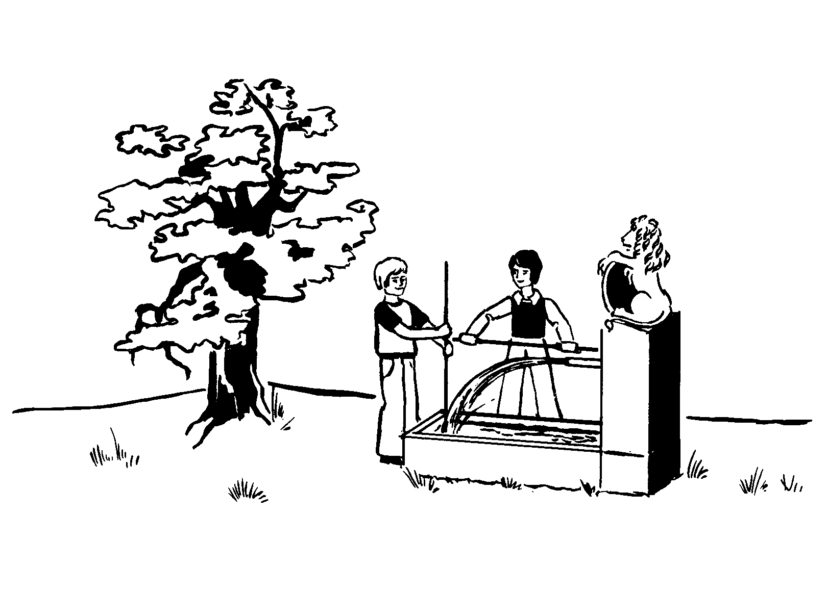 2. Es bedarf der Entdeckung, dass der Wasserstrahl, wie er aus dem Brunnen springt oder aus dem Gartenschlauch, uns darauf antworten kann: Man muss den Zufluss hin und wieder absperren, unterbrechen, das Wasser in Portionen zerhacken, Wasser-Stücke, Wasser-Stangen, Wasser-Geschosse, um zu sehen: das ist geworfenes Wasser! Denn man sieht: wenn so ein Wasserstück aus dem Zusammenhang herausgenommen wird, gelöst vom Vorher-Schießenden und vom Nachdrängenden, so ändert das nichts an der Gestalt des eigentümlich gebogenen Strahls: Wir haben also das Recht, den zusammenhängenden Strahl in Gedanken in Tropfen zu zerlegen. Wie diese Wasser-Tropfen, diese Wasser-Brocken, durch die Luft geworfen, fliegen, auf welcher Bahn sie das tun, das zeichnet uns dieser Strahl in die Luft.